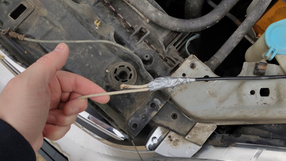 Иногда конец тросика виден, но доступ к нему невозможен. В таком случае нередко откручивают левую фару — если это облегчит доступ и если такая возможность есть в принципе.