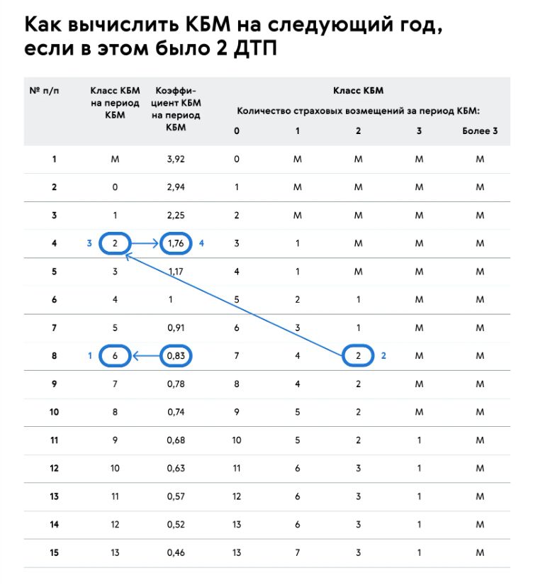 - произошло несколько ДТП в течение одного страхового года, где водитель по полису признан виновным. Каждое новое такое ДТП приводит к увеличению КБМ на следующую ступень.