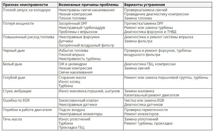- Чёрный дым — перелив топлива, плохой впрыск, засорённый воздушный фильтр, неисправность турбины.